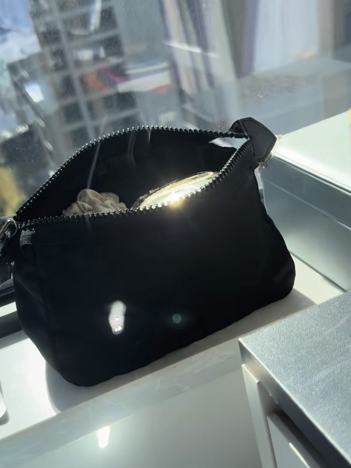 王女士在窗边化妆,窗台上的黑色化妆包被“烧”出两个洞